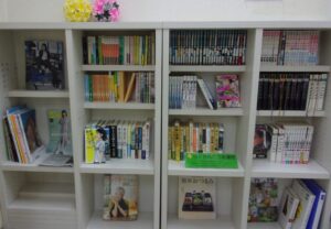 マンガ本や雑誌、最近話題になっている書籍も置いています(書籍類や本棚は有志の方から寄付していただいたものです)
